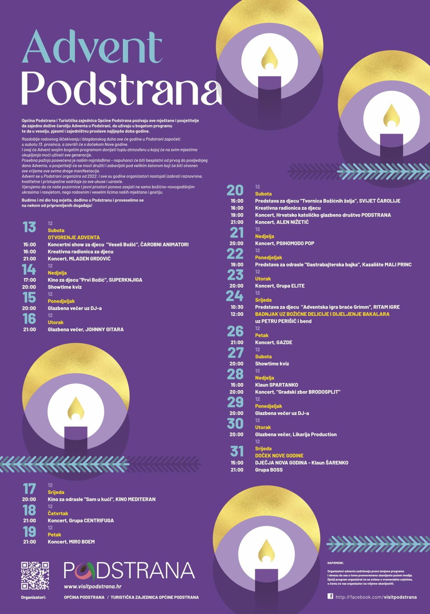 Općina Podstrana i Turistička zajednica Općine Podstrana pozivaju sve mještane i posjetitelje da zajedno dožive čaroliju Adventa u Podstrani, da uživaju u bogatom programu te da u veselju, pjesmi i zajedništvu proslave najljepše doba godine.