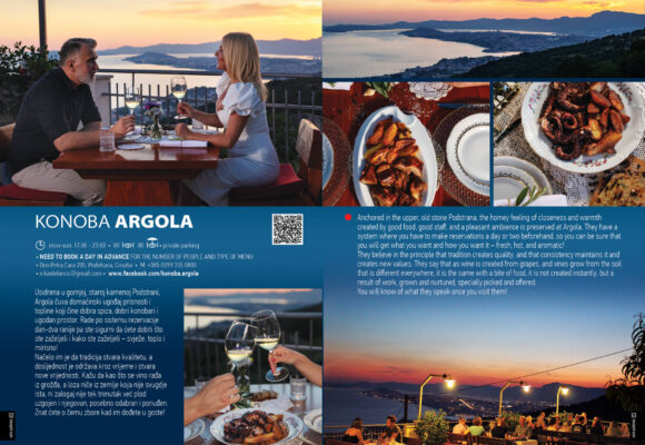 Die im alten, aus Stein errichteten oberen Dorf Gornja Podstrana gelegene Taverne Argola vermittelt das gemütliche Gefühl von Nähe und Wärme durch leckeres Essen, gutes Personal und eine angenehme Atmosphäre. Sie arbeiten nach dem Prinzip, dass Gäste einen oder zwei Tage im Voraus reservieren müssen, um sicherzustellen, dass ihre Wünsche erfüllt werden und alles frisch, heiß und duftend serviert werden kann.