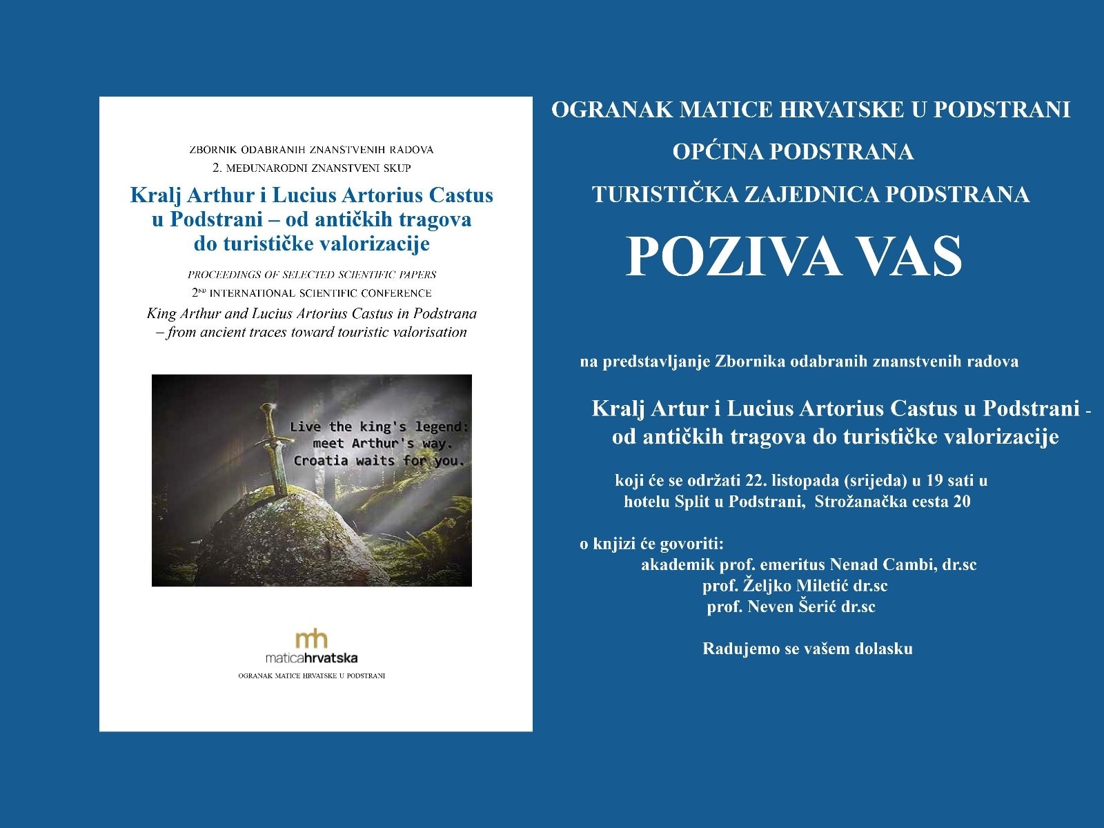 Ogranak Matice hrvatske u Podstrani, Općina Podstrana i Turistička zajednica Podstrana pozivaju vas na predstavljanje Zbornika odabranih znanstvenih radova „Kralj Artur i Lucius Artorius Castus u Podstrani – od antičkih tragova do turističke valorizacije“, koje će se održati u srijedu, 22. listopada 2025. godine, u 19:00 sati u hotelu Split u Podstrani (Strožanačka cesta 20).